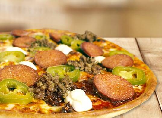 leckere Chilisauce, Käse, feurige Jalapeños, Knoblauchwurst, Tacobeef und Crème fraîche