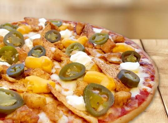 Tomatensauce, Mozzarella, Nachos, Jalapeños, Sour cream, Cheddarsauce, wahlweise Hähnchenstücken oder Tacobeef